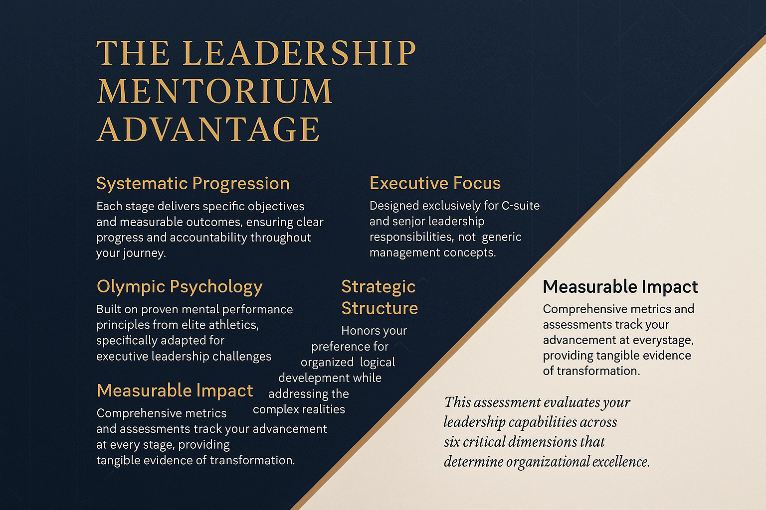 This assessment delivers more than self-reflection by establishing a measurable, actionable leadership development pathway grounded in structure rather than sentiment. Built within the Six-Stage Leadership Mentorium and informed by elite performance psychology, it evaluates leadership capacity across six critical dimensions that consistently determine long-term effectiveness and reliability.